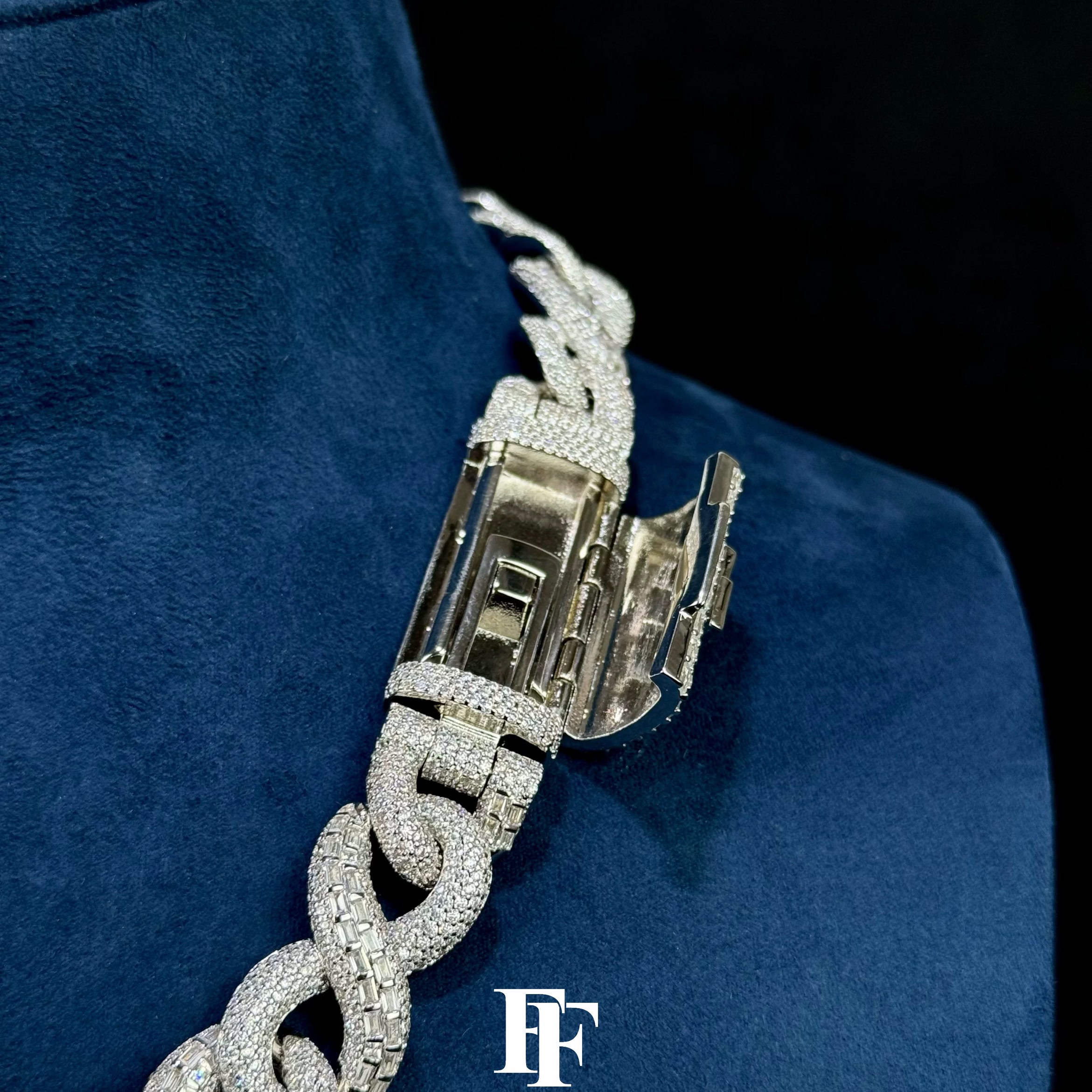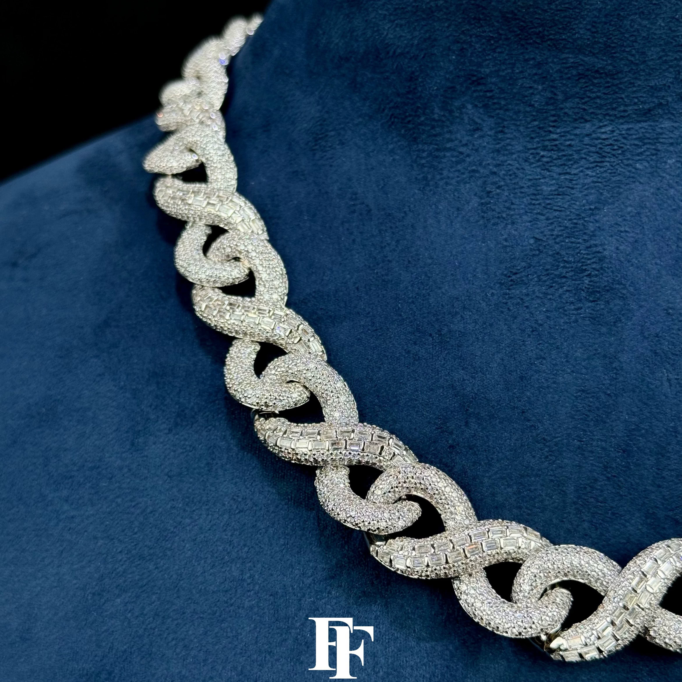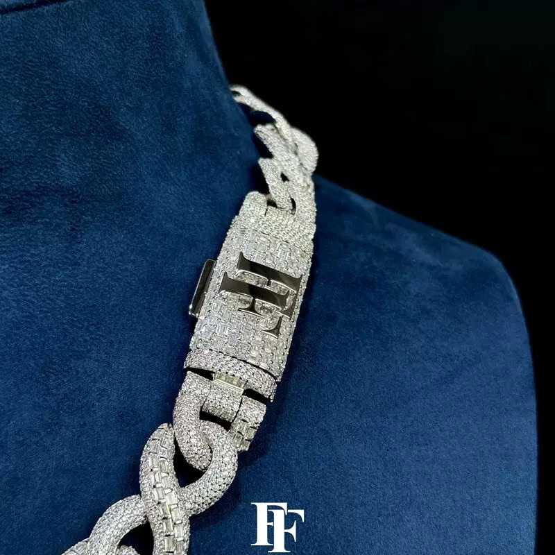Step into bold luxury with this 16mm Square Diamond Infinite Chain, crafted from solid 925 sterling silver and fully iced with D-Color VVS Moissanite stones. The unique design blends square-cut diamond settings with an infinite-style chain pattern, creating a striking piece that stands out with exceptional brilliance.
