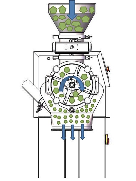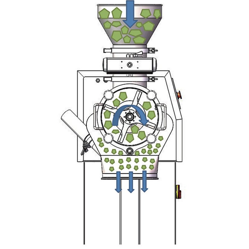 The materials to be milled are struck by these rectangular pieces of hardened steel (ganged hammer) which rotates at high speed inside the chamber. These radically swinging hammers (from the rotating central shaft) move at a high angular velocity causing brittle fracture of the feed material.